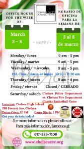Horario de oficina de Chelsea Community Connections Coalition: del 31 de marzo al 4 de abril del 2025